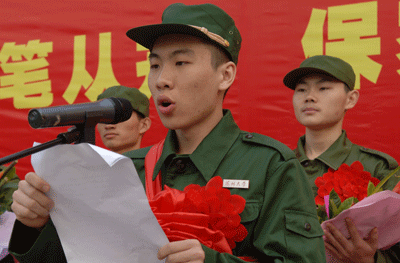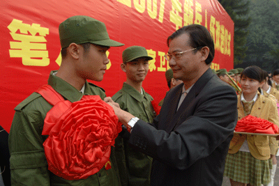攜筆從戎,保家衛國;腳踏實地,自強不息。12月13日,我校2007年新兵入伍歡送儀式在演會中心廣場隆重舉行。黨委書記江潭瑜親自為入伍學生佩戴大紅花和校徽。前來參加歡送儀式的有各學院老師、同學及部分學生家長和親友。