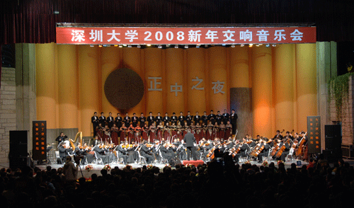 由深圳大學主辦,傳播學院承辦,深圳正中置業有限公司協辦的深圳大學2008新年音樂會于2007年12月29日在演匯中心上演。來自中央歌劇院交響樂團、中央歌劇院歌劇團、中央歌劇院合唱團的藝術家們為全校師生奉上了一臺國家級高水平的專業演出。音樂會由我國著名指揮家許知俊執棒,著名歌唱家牛莎莎、耿哲、王威、王立民、阮余群、李爽、柳紅玲、楊洋、王霞以及中央歌劇院北京四兄弟演唱組輪流上臺演唱。演匯中心觀眾如潮,座無虛席。