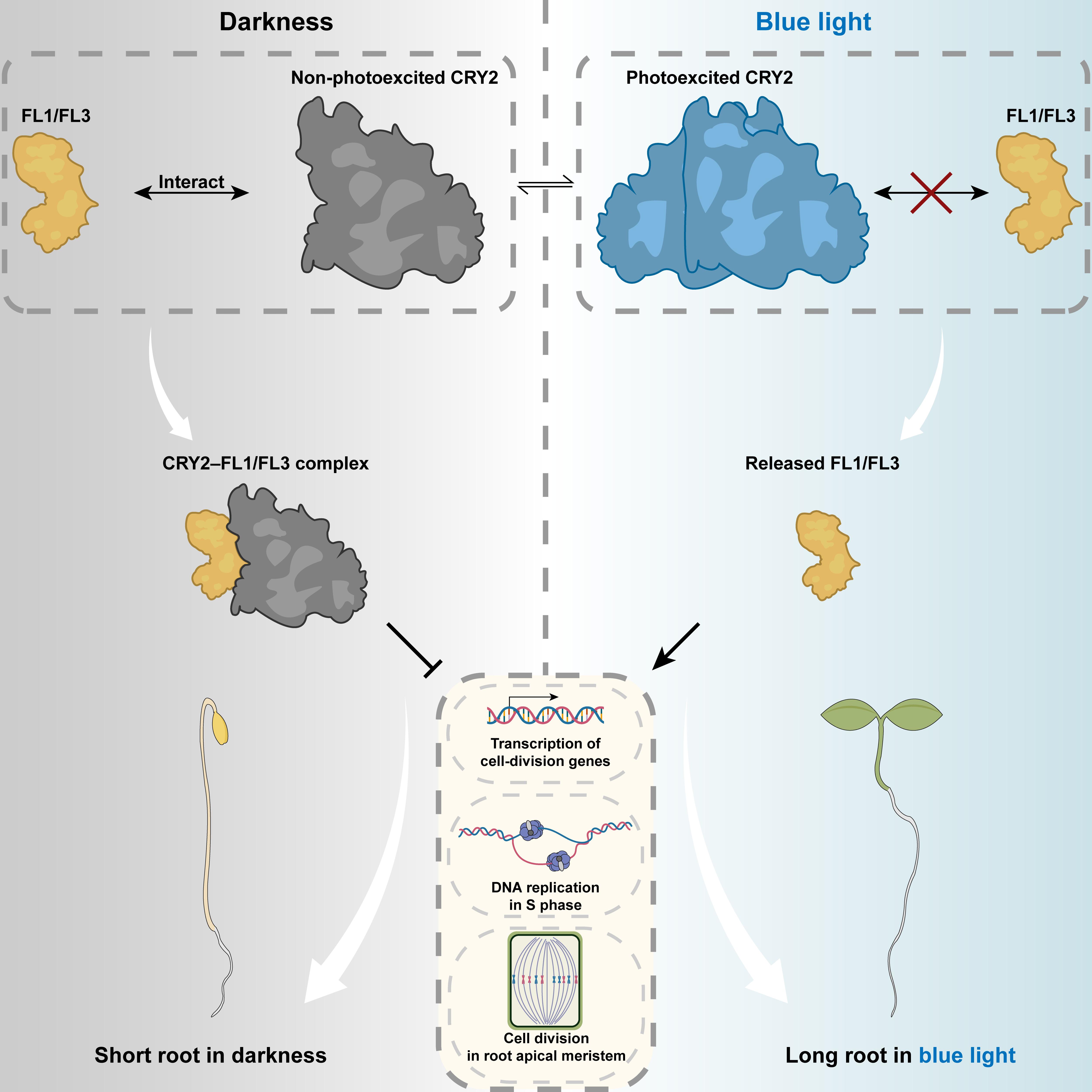 該研究發現擬南芥藍光受體CRY2在黑暗中居然調控細胞分裂、光合作用等多個重要生命過程相關基因表達。進一步表型觀察發現,黑暗條件下,在通常會被忽視的黃化苗根部,CRY2通過抑制根尖分生區細胞分裂從而抑制主根伸長,而藍光則解除該抑制。通過篩選獲得在黑暗(或非藍光條件)下同CRY2結合的蛋白FORKED-LIKE(FL)家族成員FL1和FL3,它們和CRY2的結合特異受藍光抑制。后續研究確認FL只能結合非藍光激發的CRY2單體而不能結合藍光激發后的CRY2多聚體。FL1和FL3是兩個位于CRY2遺傳學下游的促細胞分裂因子,具備結合細胞分裂基因染色質并促進基因表達的功能。黑暗中CRY2通過結合FL從而抑制FL促根尖分生區細胞分裂,進而抑制主根伸長。藍光下CRY2形成多聚體不再能同FL結合,FL功能被釋放從而促進主根伸長(圖1)。