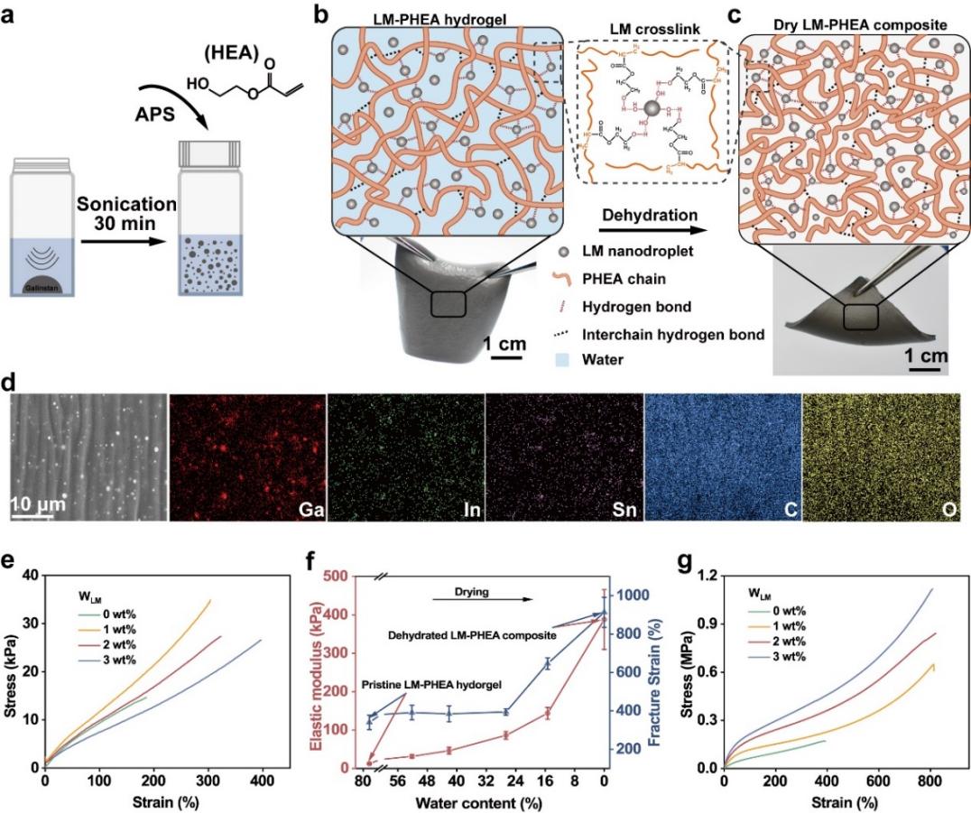 圖1. (a-d)復(fù)合水凝膠和脫水復(fù)合材料的制備;(e-g)力學(xué)性能表征。