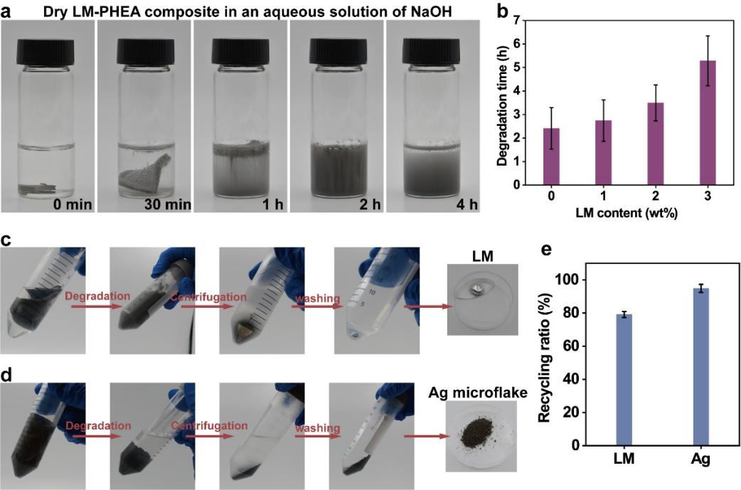 由于液態(tài)金屬納米液滴作為物理交聯(lián)點(diǎn),當(dāng)將復(fù)合材料浸沒(méi)于氫氧化鈉(NaOH)水溶液中,液態(tài)金屬納米液滴的氧化層會(huì)與NaOH反應(yīng),破壞了納米液滴與聚合物鏈間的氫鍵,從而破壞該復(fù)合材料的交聯(lián)網(wǎng)絡(luò)。因此,這些復(fù)合材料可以在NaOH水溶液中完全溶解(圖3)。而且,其中的導(dǎo)電填料可以分離出來(lái),并且回收利用。液態(tài)金屬和銀微米片的回收率可分別達(dá)到79%和95%。