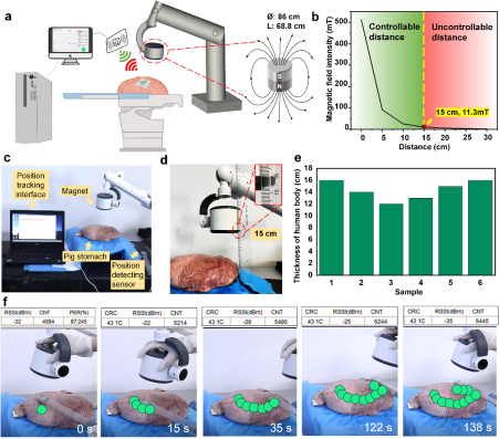 鑒于多足機器人在人體應用時需覆蓋較長的操作距離,設計了一種適用于人體尺度的設備。采用大型磁控設備,可在距離離體豬胃15 cm的高度操控機器人。在這個實驗裝置中,當機器人在體內移動時,信號探測器接收來自RFID芯片的信號。根據信號范圍,可以獲得機器人的運動路徑,并且與上述磁場的運動路徑基本相同。此外,通過應用高頻交變磁場,在胃內特定位置成功實現了多足機器人的磁熱藥物釋放。