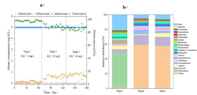 針對上述問題,本研究利用宏基因組技術研究了氫自養反硝化過程中的功能細菌及其編碼關鍵酶的基因在不同的硫酸鹽含量下的變化,分析了硝酸鹽和亞硝酸鹽的降解情況和硝酸鹽的去除率。最后,利用宏基因組技術分析了微生物群落的結構和變化,并分析了編碼氫驅動自養反硝化關鍵酶的基因,以更好地了解硫酸鹽影響硝酸鹽去除的機制。