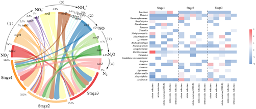 這些結果表明:硝酸鹽作為唯一的電子受體,基本上被100%去除。但SO42-導致硝酸鹽去除率降低到90% 以下。硫酸鹽負載取代了Dechloromonas(第一階段)和Thauera(第二和第三階段)作為優勢屬,而它們都包含編碼反硝化酶的所有功能基因。此外,Acidovorax 也是優勢屬(第2階段和第3階段),但它的豐度遠不如Thauera。編碼硝酸鹽還原酶的基因在所有階段都是最豐富的,但隨著SO42-的增加而減少。其中,napB在SO42-環境下占硝酸還原酶功能基因的最大比例。相比 napA 基因,功能細菌Dechloromonas 和 Thauera具有更多的 napB 基因。因此,硫酸鹽抑制了自養反硝化作用,特別是抑制了Dechloromonas及其功能基因napB。本研究為更好地了解硫酸鹽對反硝化過程的影響,特別是關鍵微生物功能基因對硝酸鹽去除具有重要意義。