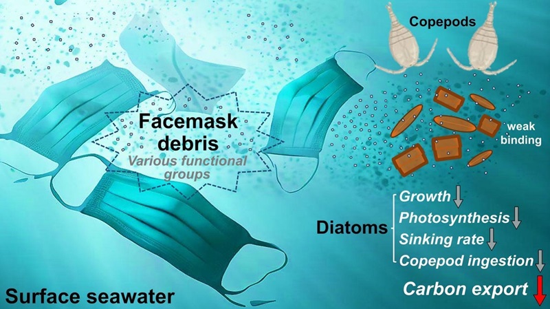 廢棄的外科口罩已成為海水中塑料垃圾的新來源,在老化過程中能釋放出大量微米和納米級塑料碎片。然而,關于這些污染物如何影響海洋浮游植物卻鮮有報導。該研究將口罩浸出物加入羽紋綱硅藻三角褐指藻和中心綱硅藻威氏海鏈藻的培養基,發現口罩碎片雖不能牢固吸附于硅藻表面,但仍可抑制其生長和光合作用,并顯著改變細胞硅質壁的理化性質。在納米尺度上,硅藻細胞壁的電勢、粘附力和含氧化合物比例降低,同時粗糙度和彈性模量有所提高。此外,在共暴露條件下,橈足類對硅藻的攝食量大幅減少,且硅藻的沉降速率顯著下降。這些結果表明,口罩碎片對硅藻的影響有可能在一定程度上減緩有機碳從表層海水向深海的輸出。