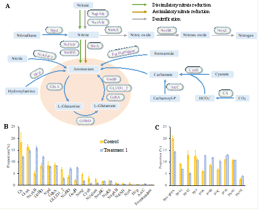 對(duì)細(xì)菌群落的宏基因組分析表明,以嗜冷桿菌屬和鹽單胞菌為主的細(xì)菌群落也參與了生物量的積累和營(yíng)養(yǎng)鹽的回收。針對(duì)雙眉藻的轉(zhuǎn)錄組學(xué)分析進(jìn)一步揭示,在廢水培養(yǎng)基中生長(zhǎng)的雙眉藻,其翻譯、折疊、分類和降解以及運(yùn)輸和分解代謝等多個(gè)途徑,與對(duì)照組相比,受到了顯著抑制。總的來說,本項(xiàng)工作為榨菜生產(chǎn)過程用水的有效生物處理,提出一個(gè)可持續(xù)的解決方案。