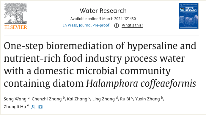 2024年3月5日,深圳大學(xué)生命與海洋科學(xué)學(xué)院胡章立教授團(tuán)隊(duì)在環(huán)境領(lǐng)域國(guó)際頂級(jí)期刊《Water Research》(影響因子:12.8)上發(fā)表題為“One-step bioremediation of hypersaline and nutrient-rich food industry process water with a domestic microbial community containing diatom Halamphora coffeaeformis”的研究論文。