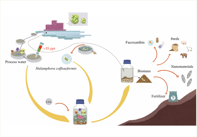 由于榨菜加工廢水具有高鹽度(大于3.5%)、低pH和豐富的營(yíng)養(yǎng)鹽等特點(diǎn),因此榨菜加工廢水的有效處理目前面臨處理成本高、能耗大且處理過程中需要使用大量的化學(xué)試劑等困難,處理不當(dāng)還會(huì)造成嚴(yán)重的環(huán)境危害。胡章立教授團(tuán)隊(duì)利用在污水中分離的一株硅藻—海生雙眉藻(Halamphora coffeaeformis)和其共生細(xì)菌構(gòu)建的微生物群落,成功實(shí)現(xiàn)了對(duì)高鹽度和富營(yíng)養(yǎng)化榨菜生產(chǎn)加工廢水的“一步”處理。處理效果具體表現(xiàn)在該生物群落對(duì)無機(jī)和有機(jī)營(yíng)養(yǎng)鹽的高回收效率:微生物群落成功地從廢水培養(yǎng)基中回收了91%的NH4+-N、78%的總氮、95%的總磷和82%的總有機(jī)碳。經(jīng)過處理14天,除草酸外,所有鑒定的有機(jī)酸和氨基酸均被完全去除。廢水中微生物群落生物量濃度達(dá)到1.74 g L-1,顯著高于對(duì)照組(10倍f 2-1培養(yǎng)基)。由于收獲的生物量中含有高價(jià)值的巖藻黃素(3 mg g-1),同時(shí)回收了大量磷元素,因此收獲的生物量既可以用來生產(chǎn)高價(jià)值的生物活性物質(zhì)還可以作為肥料或飼料進(jìn)行增值化應(yīng)用。