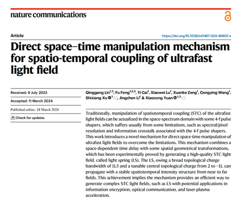 物理與光電工程學院徐世祥教授研究團隊聯合微納光電子學研究院袁小聰教授團隊在《Nature Communications》發表超快時空光場調控研究成果