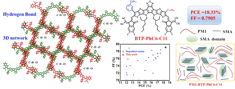 進展二:非對稱側鏈取代構筑氫鍵輔助的3D網絡受體助力高效有機光伏電池