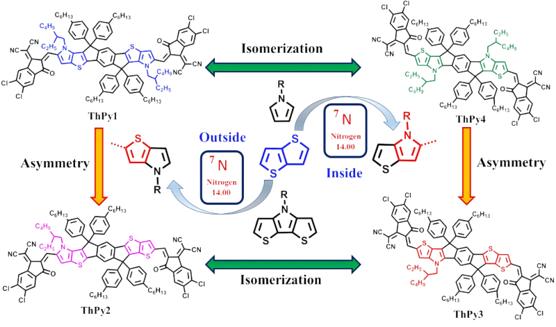 開發和合理利用新的構建單元對于設計高性能有機光伏材料,尤其是非富勒烯SMA,具有特別重要的意義。在大多數情況下,噻吩、噻吩并[3,2-b]噻吩及其衍生物是最常用的結構單元。與噻吩相比,吡咯是最富電子的五元單芳環,可以減小光學帶隙,提升分子LUMO能級。同樣,帶有吡咯的三環二噻吩并[3,2-b:2',3'-d]吡咯(DTP)賦予了SMAs一些特殊的性質,包括小的帶隙和淺的LUMO能級。迄今為止,幾乎所有SMA的含氮結構單元都是由單環吡咯或三環DTP組成,而雙環噻吩并[3,2-b]吡咯(ThPy)作為結構單元應用到非富勒烯SMA,甚至應用到整個有機電子領域都很少受到關注。基于此,我們以新型的ThPy為構建單元發展了四種新的A-D-A型SMA(ThPy1、ThPy2、ThPy3和ThPy4)。其中,ThPy1和ThPy4是一對具有中心對稱結構的異構體,ThPy2和ThPy3是另一對具有不對稱中心核的異構體。每對異構體中兩個分子之間的區別在于中心核中吡咯環的位置:ThPy1和ThPy2中吡咯位于中心核外圍,而ThPy3和ThPy4中吡咯環位于中心核內部。與對比分子IT-4Cl相比,基于ThPy的四個受體由于吡咯的強給電子能力而表現出吸收紅移和前沿軌道能級上移的特征。密度泛函理論(DFT)計算表明,與ThPy1和ThPy2(N原子在外)相比,IT-4Cl、ThPy3和ThPy4(N原子在里)由于S???O分子內非共價相互作用表現出相對更小的扭轉角,十分有助于改善分子堆積和提高電子遷移率。器件結果表明,基于PM6:ThPy3的器件實現了15.3%的 器件效率(PCE)和高達77%的填充因子(FF),該效率是基于A-D-A型SMA的OSC的最高值之一。