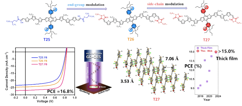 研究團隊通過端基工程及側鏈工程的策略對小分子給體逐步優化,分別設計合成了以氰基酯為端基的小分子給體T25,以羅丹寧為端基的T26以及以氯代為側鏈的T27,并系統研究了端基及側鏈工程對小分子給體理化性質、活性層生長機理和器件性能的影響,最終基于T27的小分子電池獲得了高達16.8%器件效率,為二元小分子電池最高效率之一。且當其活性層膜厚超過300nm時,器件效率依然可以保持15%以上,這同時也是二元小分子電池厚膜最高效率之一。器件物理和形貌分析可知,基于T27:Y6的混合膜激子解離時間更短,受電荷復合及陷阱復合影響更小,載流子遷移率更平衡,分子π-π堆積更緊密,以及擁有更優異的互穿網絡結構。此外,為了研究共混膜生長過程中給受體分子聚集及縱向分布情況,研究者首次將輝光放電發射光譜技術(GD-OES)應用于OSCs。通過原位與非原位測試結果表明,給受體結合度和薄膜生長速率與器件性能緊密相關。其中,相比于T26:Y6和T25:Y6兩種共混膜,T27:Y6共混膜具有較高的給受體結合度與較慢的薄膜生長速率。這些結果均為T27:Y6的高性能提供進一步佐證。