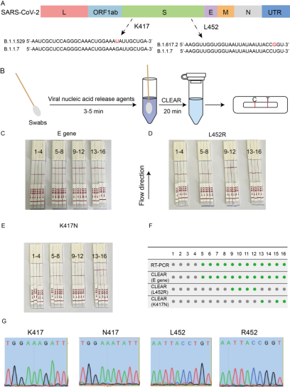 3.精準分型檢測:通過編程化的crRNA設計,該系統能夠精準識別K417N、K417T和L452R等單堿基突變位點,實現對SARS-CoV-2變異株的無擴增分型。實驗結果顯示,CLEAR體系在對標準品和臨床樣本的分型檢測中表現優異,具備應用于多種呼吸道病原體檢測的潛力。
