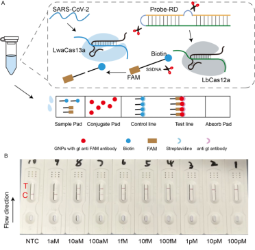 在COVID-19大流行期間,居家檢測作為一種快速、便捷且低成本的診斷手段,在公共衛生防控中發揮了重要作用。然而,市售抗原檢測試劑盒由于靈敏度不足,易導致假陰性結果;RT-PCR盡管靈敏度高,但需實驗室環境支持,不適合家庭使用。劉翼振團隊研發了一種結合CRISPR級聯系統與側向流免疫層析分析的新型檢測方法,能夠實現無擴增條件下的高靈敏度SARS-CoV-2檢測,解決了現有檢測方法的不足。
