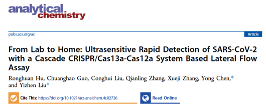 深圳大學化學與環境工程學院劉翼振副教授團隊在Nature Index期刊Analytical Chemistry(中科院大類一區,TOP期刊)上發表了題為“From Lab to Home: Ultrasensitive Rapid Detection of SARS-CoV-2 with a Cascade CRISPR/Cas13a-Cas12a System Based Lateral Flow Assay”的研究論文。全文鏈接:https://pubs.acs.org/doi/10.1021/acs.analchem.4c02726副教授劉翼振與副研究員陳勇為論文通訊作者,碩士研究生胡镕渙為第一作者,深圳大學為唯一通訊單位。本研究得到了科技部國家重點研發計劃、廣東省自然科學基金面上項目和深圳市科技計劃穩定支持項目的大力支持。