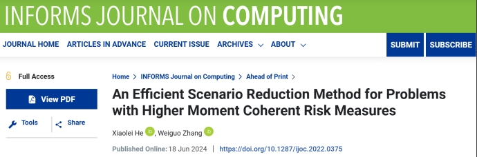 近日,深圳大學(xué)管理學(xué)院管理科學(xué)系助理教授何小雷和教授張衛(wèi)國(guó)的學(xué)術(shù)論文“An Efficient Scenario Reduction Method for Problems with Higher Moment Coherent Risk Measures”被國(guó)際頂級(jí)期刊 INFORMS Journal on Computing(IJOC)錄用并在線(xiàn)發(fā)表。該期刊是美國(guó)運(yùn)籌學(xué)與管理科學(xué)協(xié)會(huì)(INFORMS)的會(huì)刊之一,也是國(guó)際公認(rèn)的商科頂尖期刊UTD24之一。該研究成果以何小雷助理教授為第一作者、張衛(wèi)國(guó)教授為通訊作者、深圳大學(xué)管理學(xué)院為唯一署名單位。據(jù)統(tǒng)計(jì),IJOC自2008年以來(lái)發(fā)表的論文中,僅由中國(guó)內(nèi)地的學(xué)者和單位署名論文的數(shù)量不超過(guò)25篇,其中張衛(wèi)國(guó)教授和何小雷助理教授合作發(fā)表了2篇。